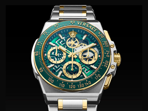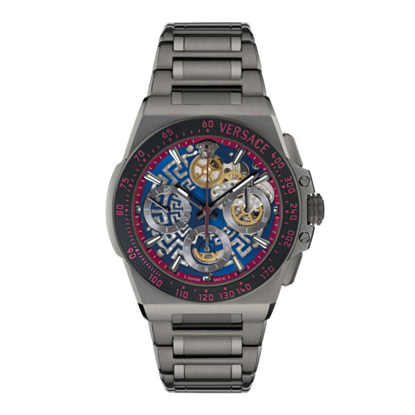 ヴェルサーチェ初となるスケルトン仕様の自動巻きクロノグラフムーブメントを搭載。